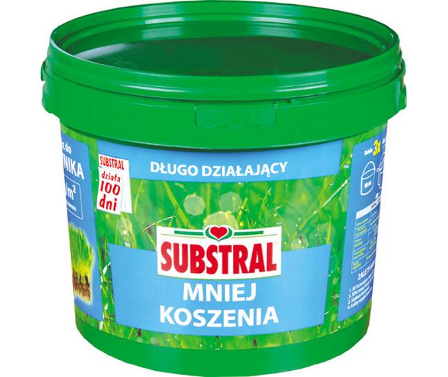 Nawóz SUBSTRAL 100 dni Mniej koszenia jest przeznaczony do zadbanych trawników. Zawarte składniki pokarmowe spowodują, że trawnik będzie ładnej wyglądał i nie wymagał częstego koszenia. Po zastosowaniu nawozu SUBSTRAL 100 dni Mniej Koszenia średnio trawę kosimy dwa razy rzadziej i otrzymujemy o połowę mniej trawy do wyrzucenia.